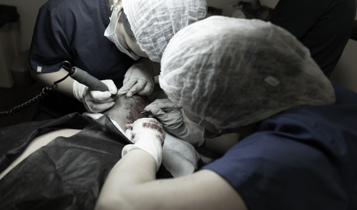 Estrazione manuale dei follicoli uno ad uno – I follicoli vengono prelevati con cura dalla zona donatrice.