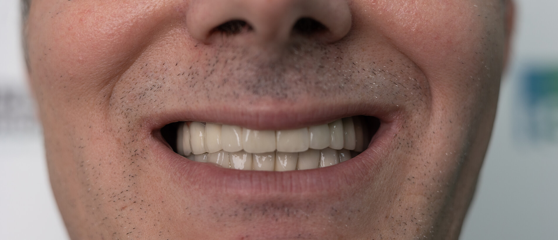 Dopo la guarigione e l’integrazione degli impianti, Alexandru è tornato per la seconda fase. Abbiamo completato l’arcata superiore fissando una protesi definitiva in ceramica avvitata sui 4 impianti. Per l’arcata inferiore, abbiamo restaurato i suoi denti naturali e applicato le corone in ceramica definitive sugli impianti, ottenendo un equilibrio perfetto tra estetica e funzionalità.